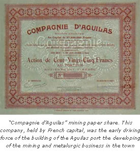 In the last decade of the 18th century were anoticed in Aguilas an increased of the commercial traffic through its port, being at the end of the 19th century when the English companies focus on the commercial potential of its port for the export and Shipping iron ore and esparto on a large scale. The establishment of a permanent British colony impregnated to the village and its inhabitants of a particular idiosyncrasy.