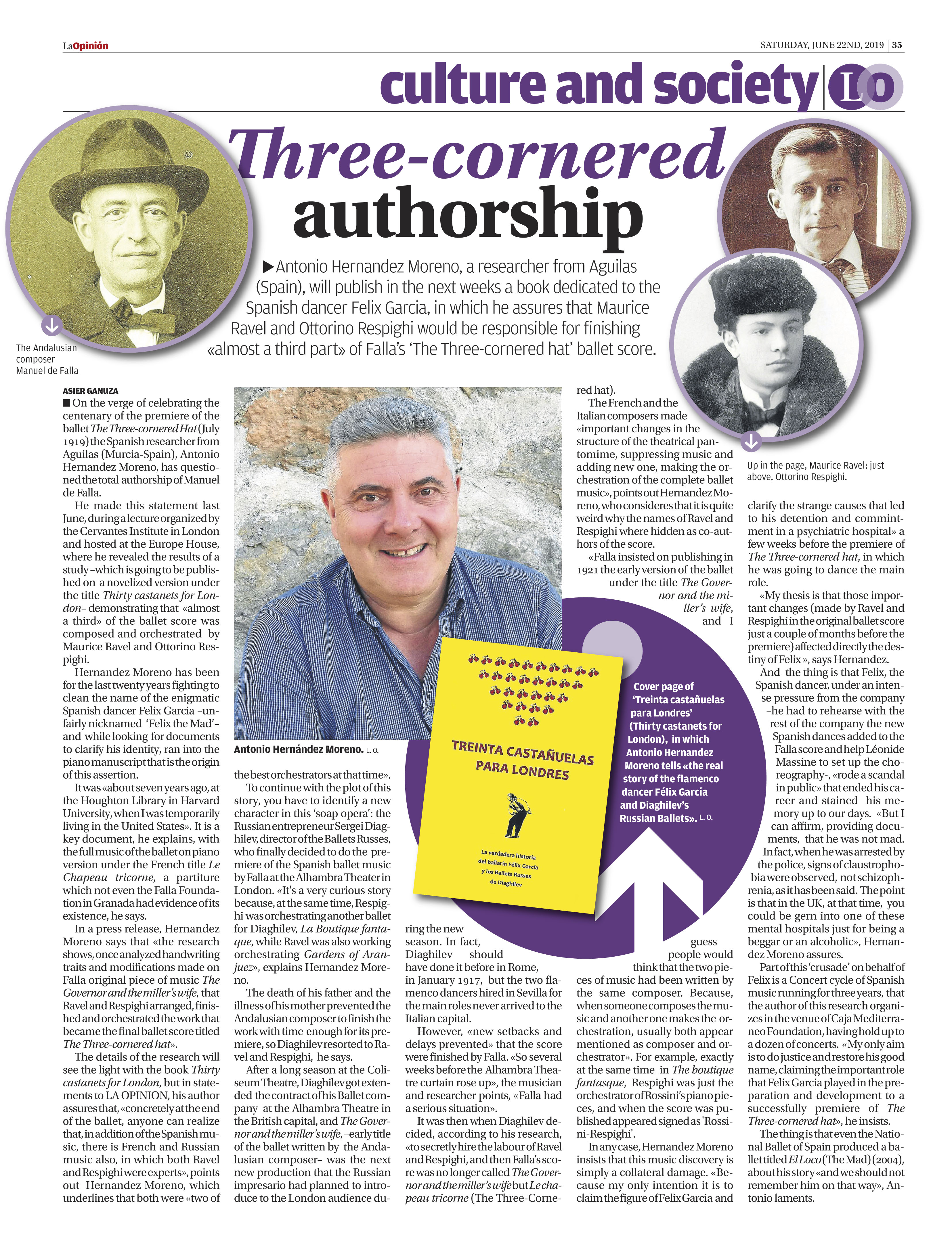 Up till now, nobody had found out Felix identity or ascendence (it is believed that he was from Sevilla or Cadiz) neither the strange circumstances he was committed in a South London mental hospital in Epsom in 1919, just several weeks before the ballet premiere in London. The worldwide research in American, British, French and Spanish archives have resulted in a book in which is claimed Felix's good sense and his contribution to the ballet choreography and it success. Throughout the book -a novelized story-, moreover, unpublished facts about other important artists of that time. Thinking on the Three Cornered Hat centenary to be celebrate in 2019 Antonio Hernandez has got in touch with different authorities and mass media here in Spain and in England, organizing a cycle of memorial concerts and lectures in order to pay honor to the figure of the dancer Felix Garcia and erect a memorial stone, financed by his own, on the site Felix was buried.